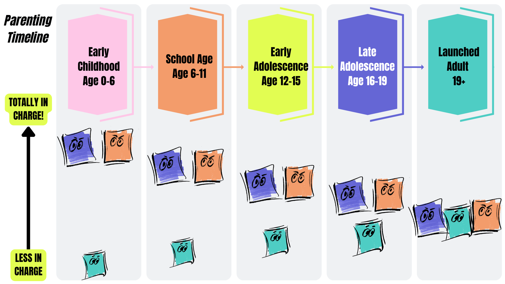 - Late adolescence: The parent becomes more of an advisor. Authority matches demonstrated responsibility. Stay out later on Saturday? Sure, if the track record supports it.
