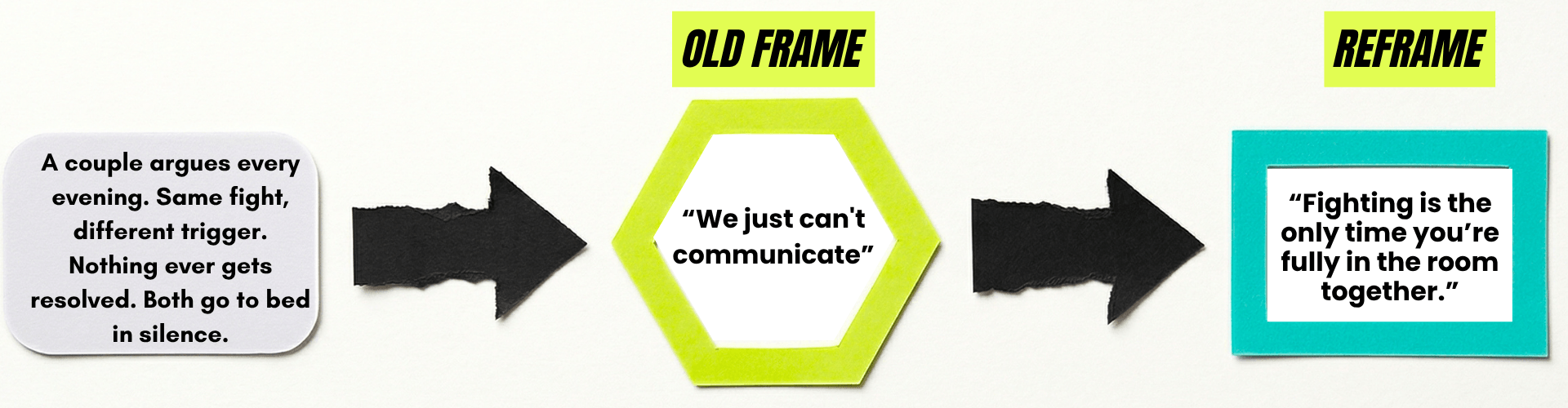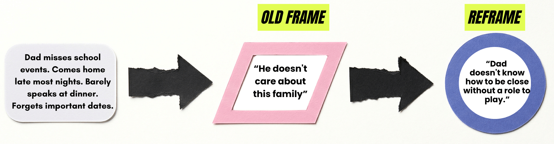 A great reframe keeps the familyâs evidence but changes its meaning. Essentially, weâre proposing something that asks if the same facts could mean something else.