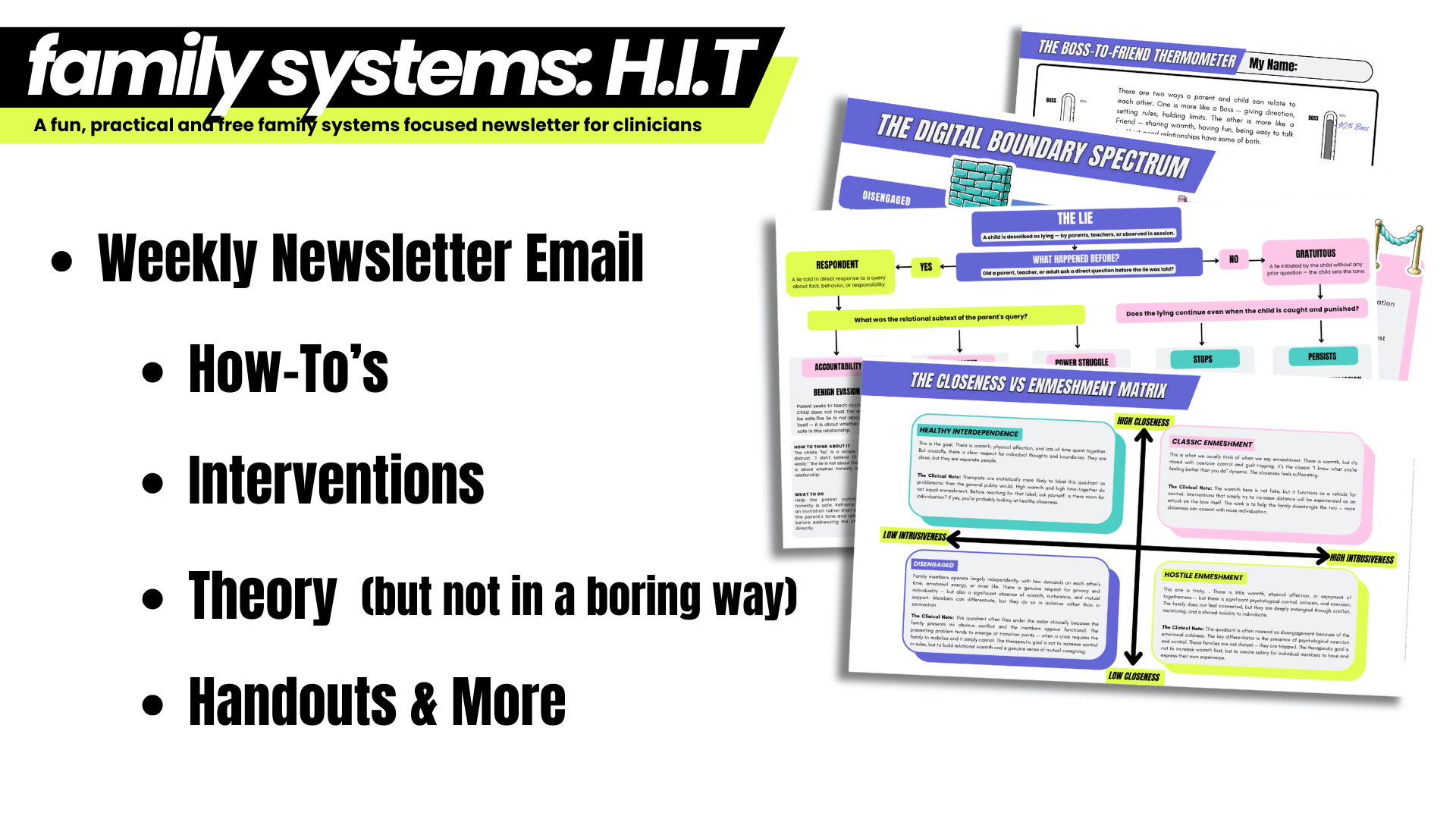 A weekly email for anyone interested in learning more about family systems therapy. I'm determined to make this the most useful email you get all week - expect PDF's, handouts, checklists and a bit of systemic theory.